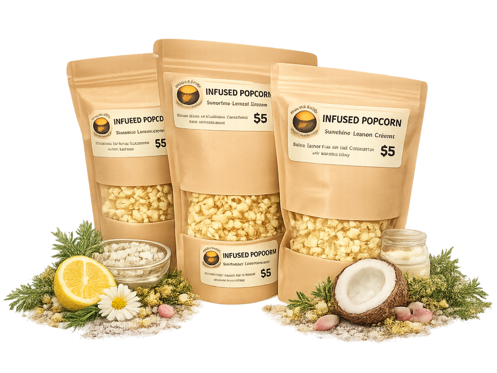 Our kettle corn starts with organic Amish popcorn, a heritage kernel known for its clean flavour and delicate crunch. We melt rich, golden ghee and whisk in our houseâmade infused sugar, letting the botanicals bloom in the heat. As the kernels pop, the infused sugar caramelizes directly onto them, creating that classic sweet shell â crisp, light, and never sticky.